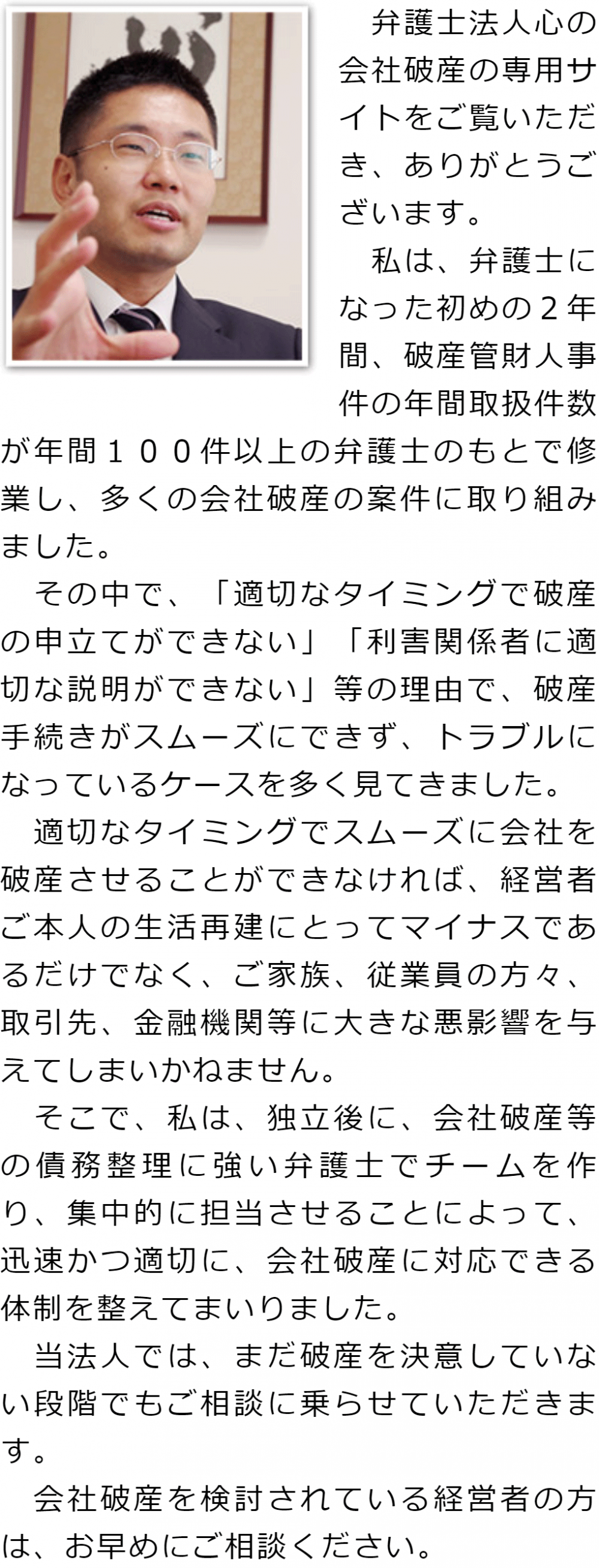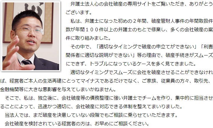 トップその他代表メッセージ 階層構造▼ その他(目次) 代表メッセージ その他(目次)その他トップ共通バナー元※削除不可新着情報(心グループニュース)電話・テレビ電話相談について代表メッセージ相談するタイミングを迷われている方へ金融機関との関係を壊したくない方へお客様相談室グループ概要費用詳細心グループのメディア出演実績マスコミ関係者の方へ関連リンクプライバシーポリシー 受付時間 平日 9時~21時、土日祝 9時~18時 夜間・土日祝の相談も対応します(要予約) 所在地 〒120-0034 東京都足立区千住2-4オカバツインタワービル イースト5F 0120-41-2403 お問合せ・アクセス・地図