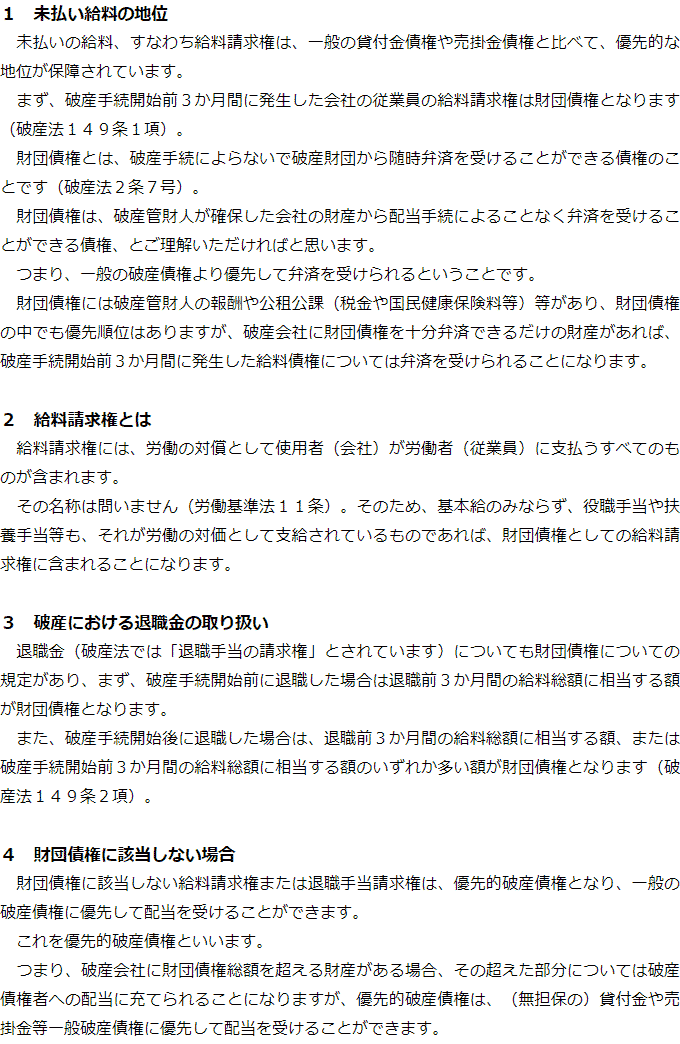 お役立ち情報・Q&A(目次)お役立ち情報・Q&Aトップお役立ち情報会社破産で従業員に必要となる対応Q&A会社が破産した場合の未払いの給料に関するQ&A 受付時間 平日 9時~21時、土日祝 9時~18時 夜間・土日祝の相談も対応します(要予約) 所在地 〒120-0034 東京都足立区千住2-4オカバツインタワービル イースト5F 0120-41-2403 お問合せ・アクセス・地図