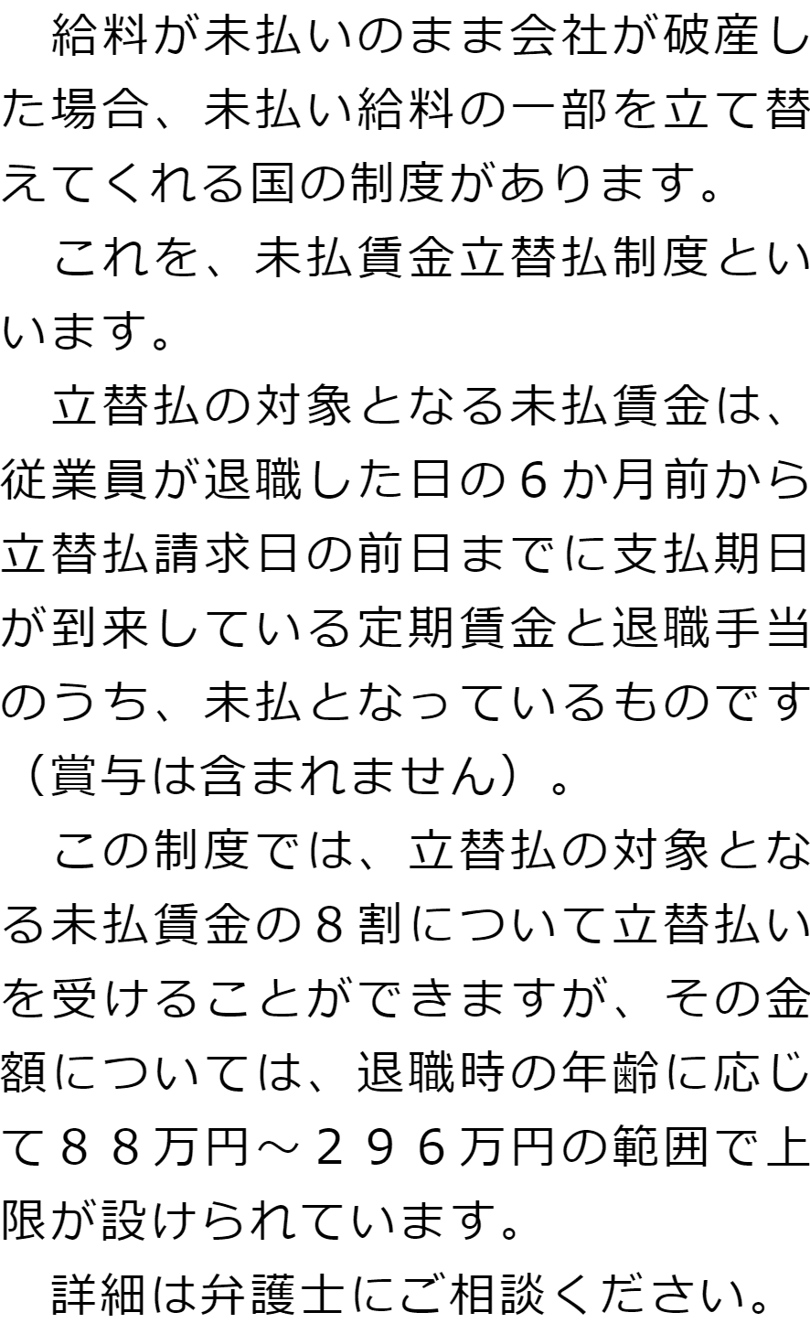 Q会社が破産した場合、未払いの給料はどうなりますか?AQ破産手続きの中で従業員が未払い給料の支払いを受けられない場合、何か救済制度はないのですか?A お役立ち情報・Q&A(目次)お役立ち情報・Q&Aトップお役立ち情報会社破産で従業員に必要となる対応Q&A会社が破産した場合の未払いの給料に関するQ&A 受付時間 平日 9時~21時、土日祝 9時~18時 夜間・土日祝の相談も対応します(要予約) 所在地 〒120-0034 東京都足立区千住2-4オカバツインタワービル イースト5F 0120-41-2403 お問合せ・アクセス・地図